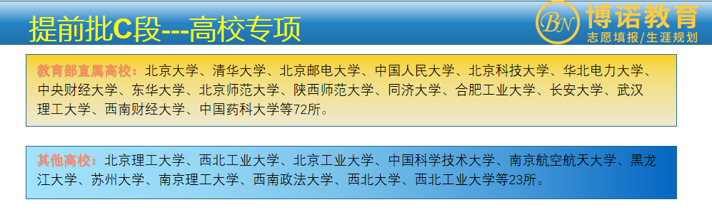 高校专项在提前批C段可填报2所学校(即1个第一志愿和1个第二志愿),每所学校最多6个专业志愿和1个专业服从调剂选项,第一志愿录取结束后,若有高校未完成计划,则向高校投放第二志愿填报有该校的未录取考生档案,供高校审录。