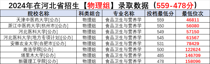2024年各院校食品卫生与营养学专业在河北招生录取分数:
