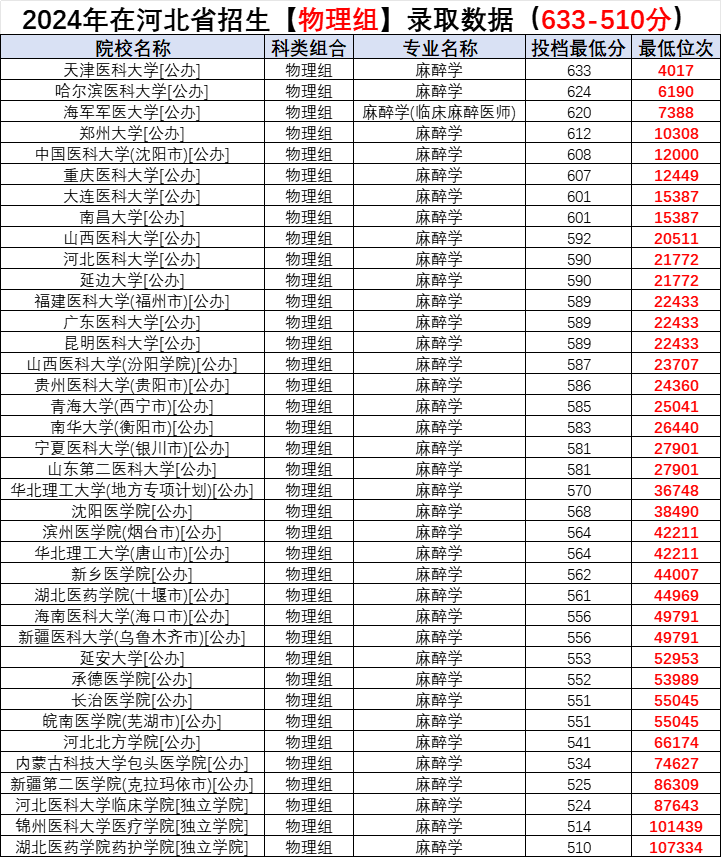 2024各院校麻醉学专业在河北招生录取分数: