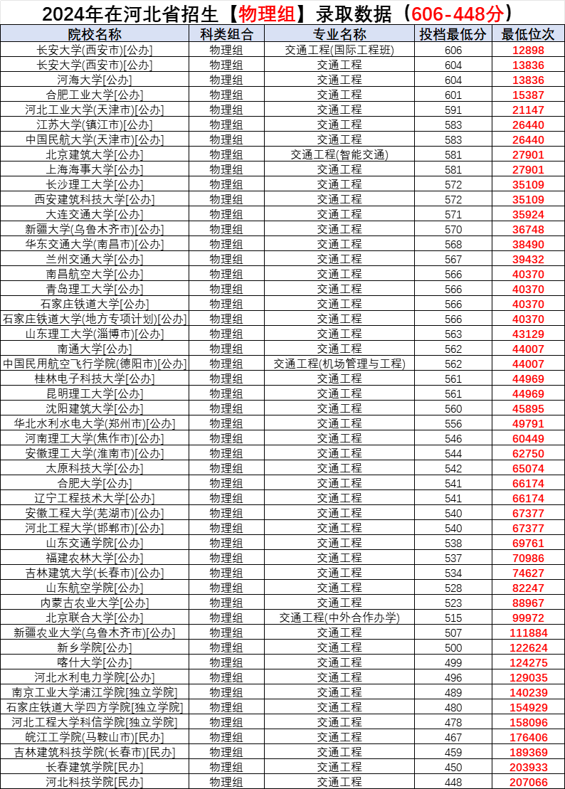 2024年各院校交通工程专业在河北录取分数: