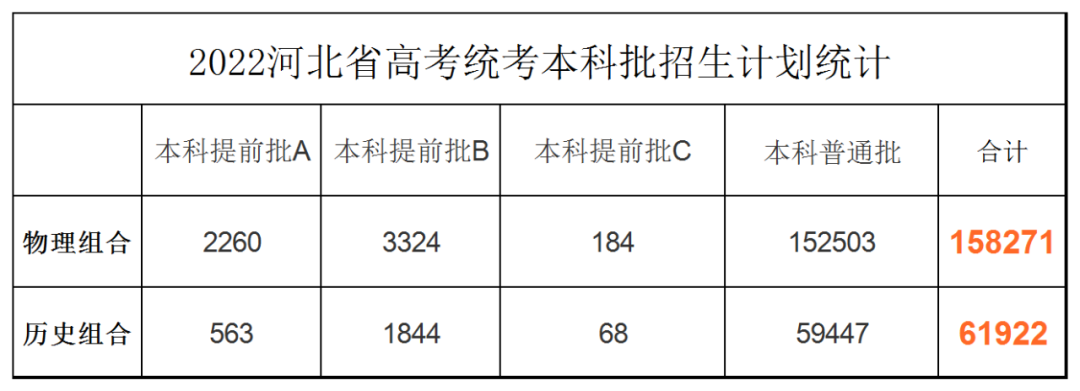 2022年河北省物理科目组合本科院校招生计划数为:本科提前批A为2260人,本科提前批B为3324,本科提前批C为184,本科普通批为152503人,2260+3324+184+152503=158271,也就是说,如果你的位次在158271以内,大概率会被物理科目组合本科院校录取。